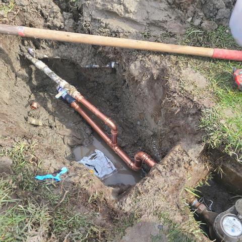 Called for a water leak in the front yard, approximately 2 feet from the water meter. An irrigation shutoff valve was located in the area. Excavation was required to expose the piping and fittings. Upon inspection, multiple joints were found to be broken and actively leaking. The damaged sections were removed and properly re-piped to restore service as quickly as possible. All repairs were secured to prevent future leaks. Once completed, the system was pressurized and tested for proper operation. No leaks were present at the time of testing. Warranty: Six (6) months on labor and parts