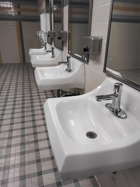 We replaced four polished chrome Chicago single metering bathroom faucets with new ones, along with four stainless steel flexible supply lines. Our work comes with a 90-day warranty.