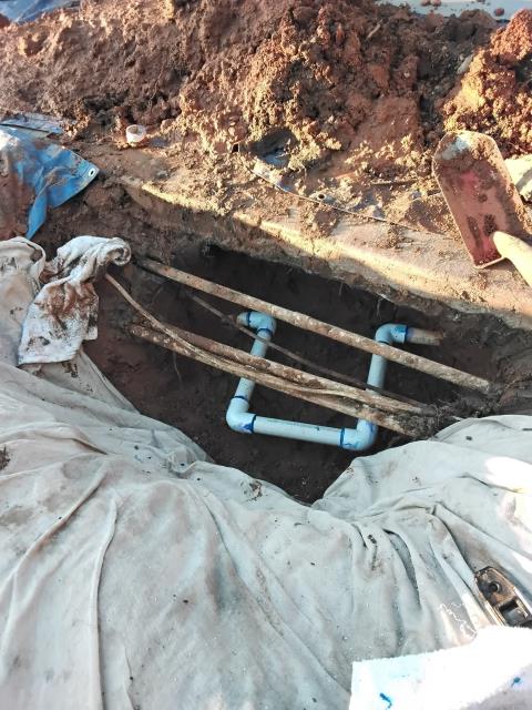 Water leak in front yard: To excavate to locate main water leak in grass area were leak detection company mark it,had to excavate underneath driveway to locate water leak found a 1 1/4 bursted pvc water line on coupling. Install approximately 3 ft of 1 1/4 pvc pipe and reconnect with four 1 1/4 pvc ells turn on water on check ok back fill.